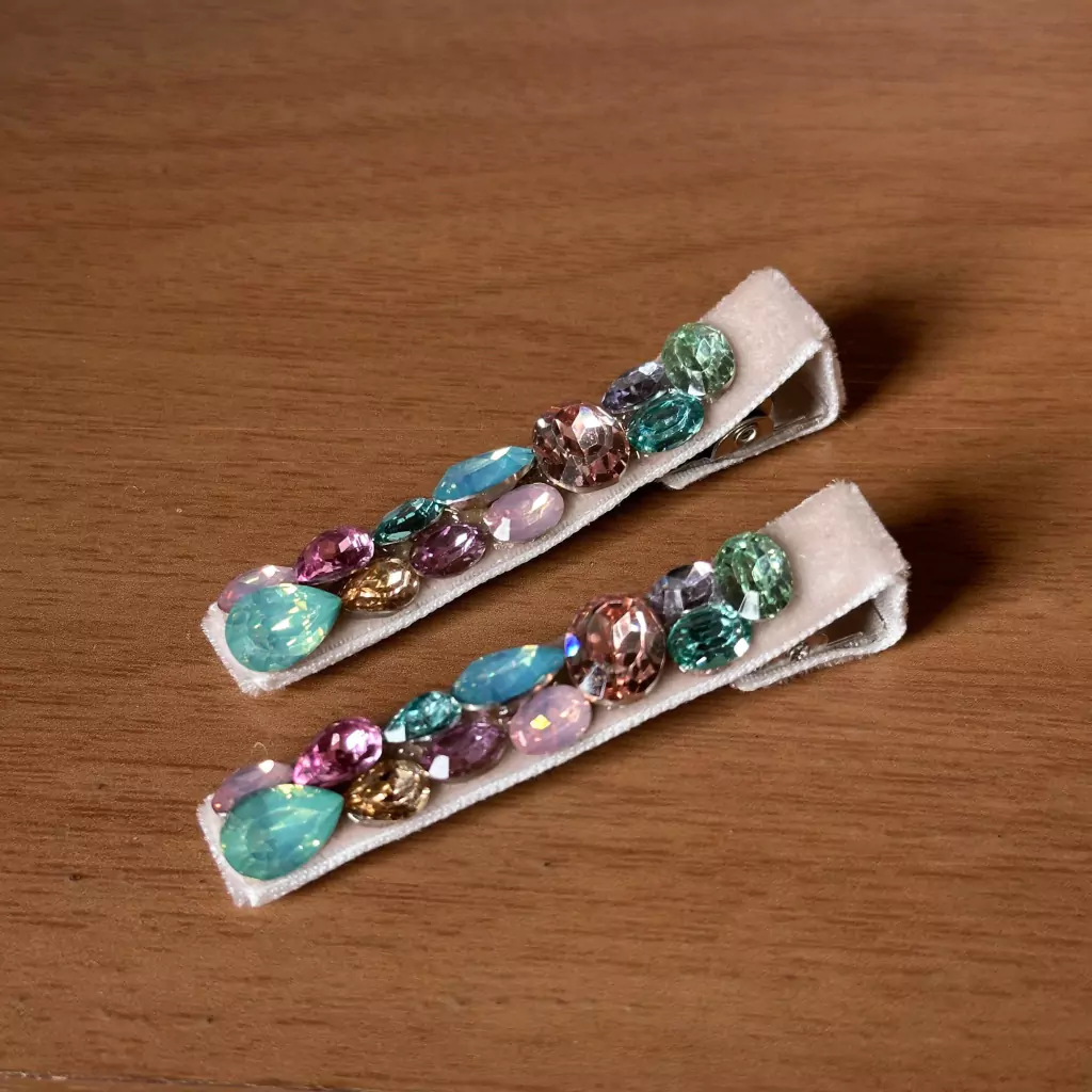 Clips Slim forrado em veludo com pedras em cristal e/ou ABS e bico de jacaré com pressão.