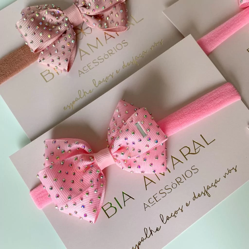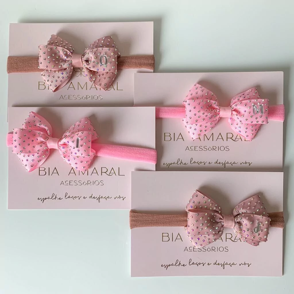 Laço com aplicação de micro cristais e inicial na fita de gorgurão, disponível no bico de jacaré forrado com borrachinha ou na faixa de meia de seda colorida.